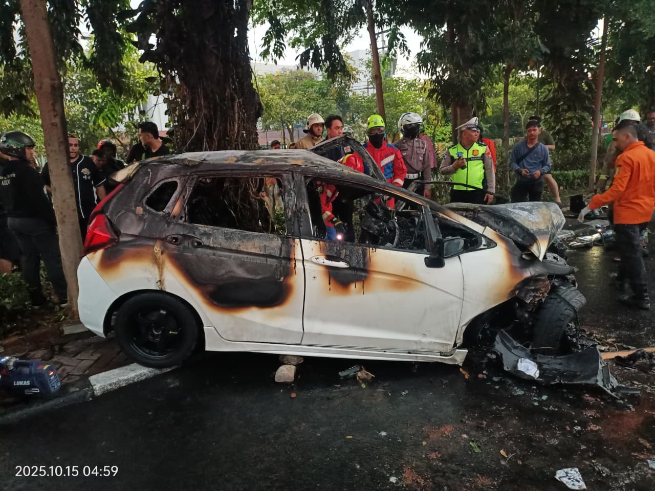 Proses evakuasi jenazah laka lantas kebakaran mobil di Jalan Manyar Kertoarjo, Surabaya, Rabu, 15 Oktober 2025-Dok. Command Center 112 Surabaya-