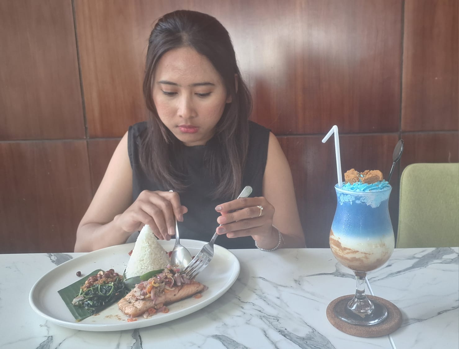 Chef yang bergelut di dunia kuliner sejak 2006 itu meletakkan sambal matah di atas daging salmon.