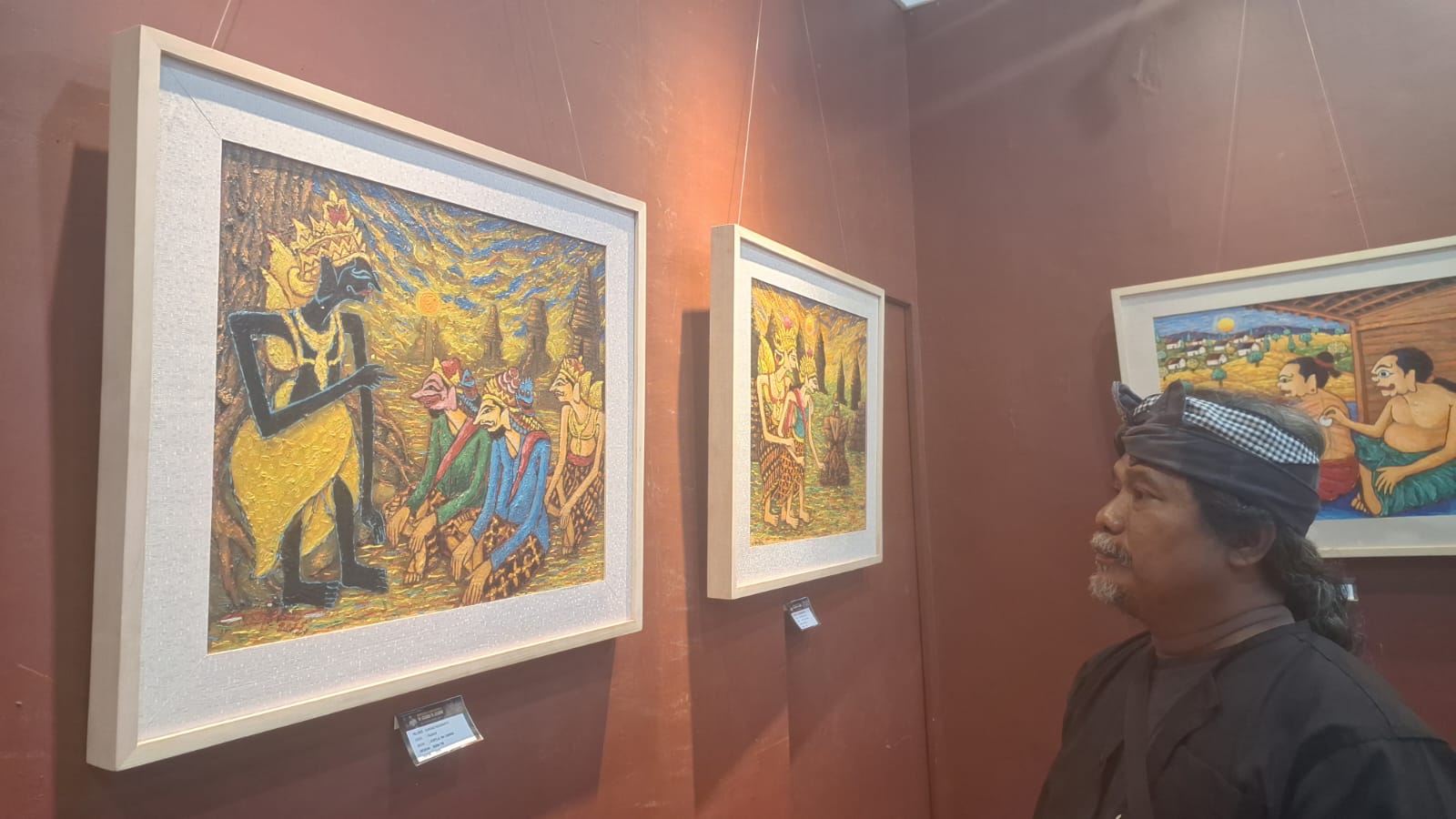 Seorang pengunjung menikmati lukisan-lukisan yang tersaji dalam pameran Ya Jagadku Ya Jagadmu di Balai Pemuda, Surabaya, 18 Oktober 2025.-Guruh D.N.-HARIAN DISWAY