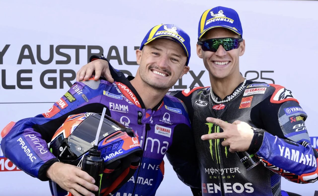 MotoGP Australia 2025: Quartararo rebut pole position dari Bezzecchi di detik terakhir. Foto: Fabio Quartararo (kanan) dan Jack Miller merayakan front row MotoGP Australia, 18 Oktober 2025. -Gold and Goose-