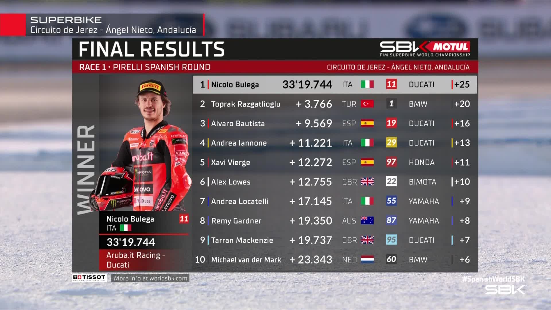 Setelah menuntaskan 20 lap, Nicolo Bulega memastikan kemenangannya di Race 1 WorldSBK seri Jerez 2025. Toprak finis kedua, sementara Bautista melengkapi podium di posisi ketiga.