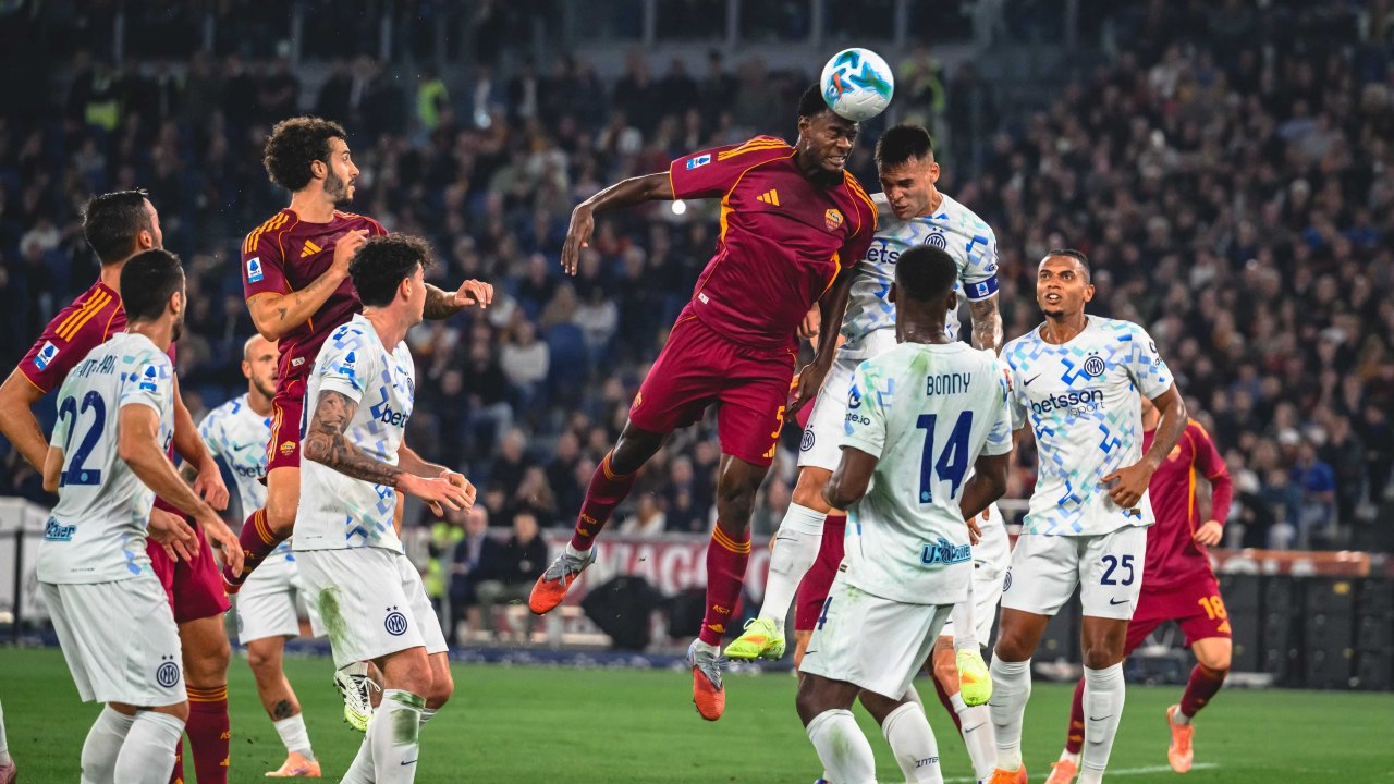 Evan N'Dicka melakukan duel udara dengan Lautaro Martinez saat AS Roma melawan Inter Milan di laga lanjutan Serie A pada 19 Oktober 2025-@OfficialASRoma-X