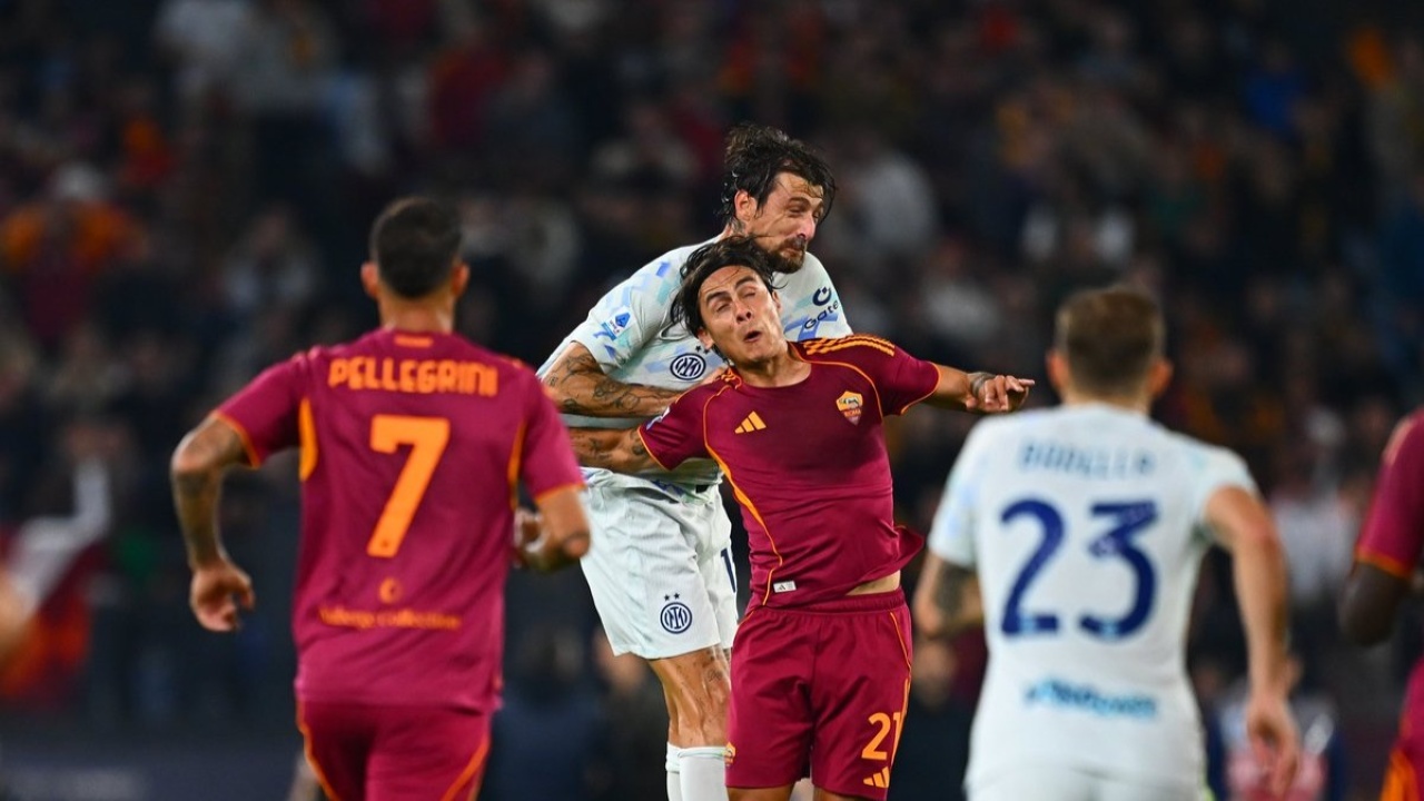 Francesco Acerbi melakukan duel udara dengan Paulo Dybala saat Inter Milan melawan AS Roma di laga lanjutan Serie A pada 19 Oktober 2025-@Inter_en-X