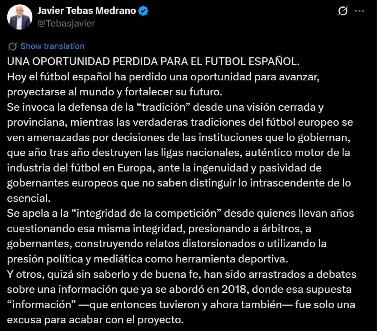 Namun, Tebas menyindir bahwa alasan sebenarnya adalah tekanan politik dan penolakan internal dari sejumlah klub besar. Dalam unggahannya di X (Twitter), ia menyatakan kekecewaannya.