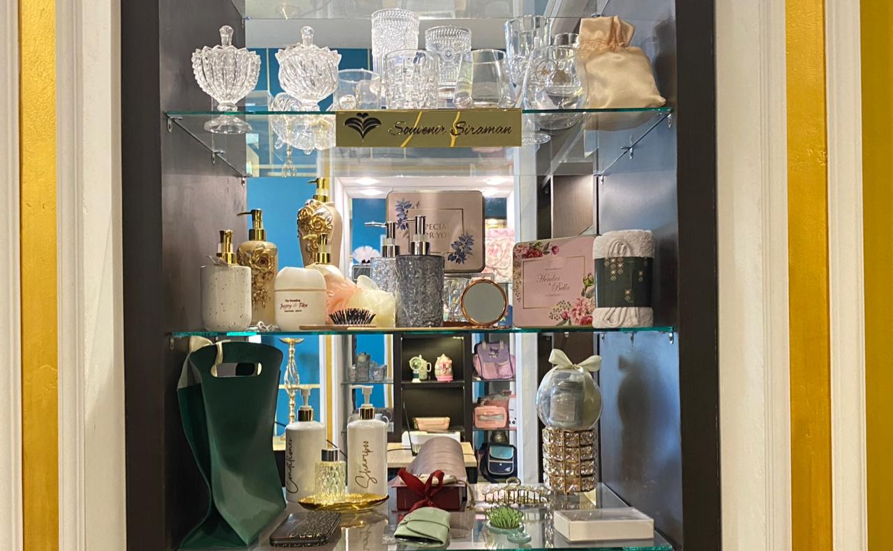 Rak tampilan produk Anaria Souvenir yang disegmentasikan khusus untuk souvenir di tradisi siraman.-Nazwarahma-HARIAN DISWAY