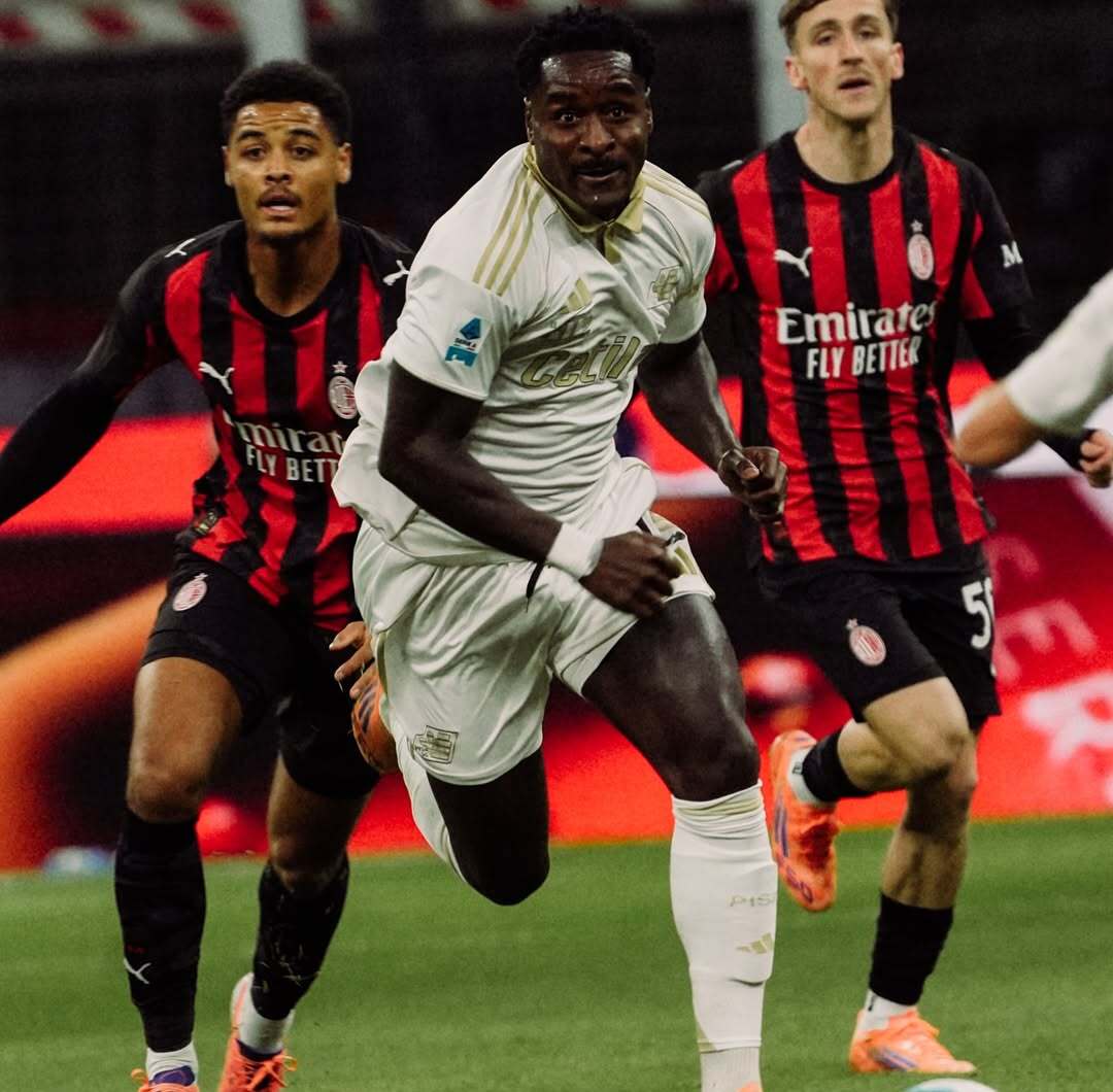 Aksi penyerang Pisa, Mbala Nzola, ketika berusahan melewati hadangan lini pertahanan AC Milan. Sabtu, 25 Oktober 2025.--Instagram @pisasportingclub