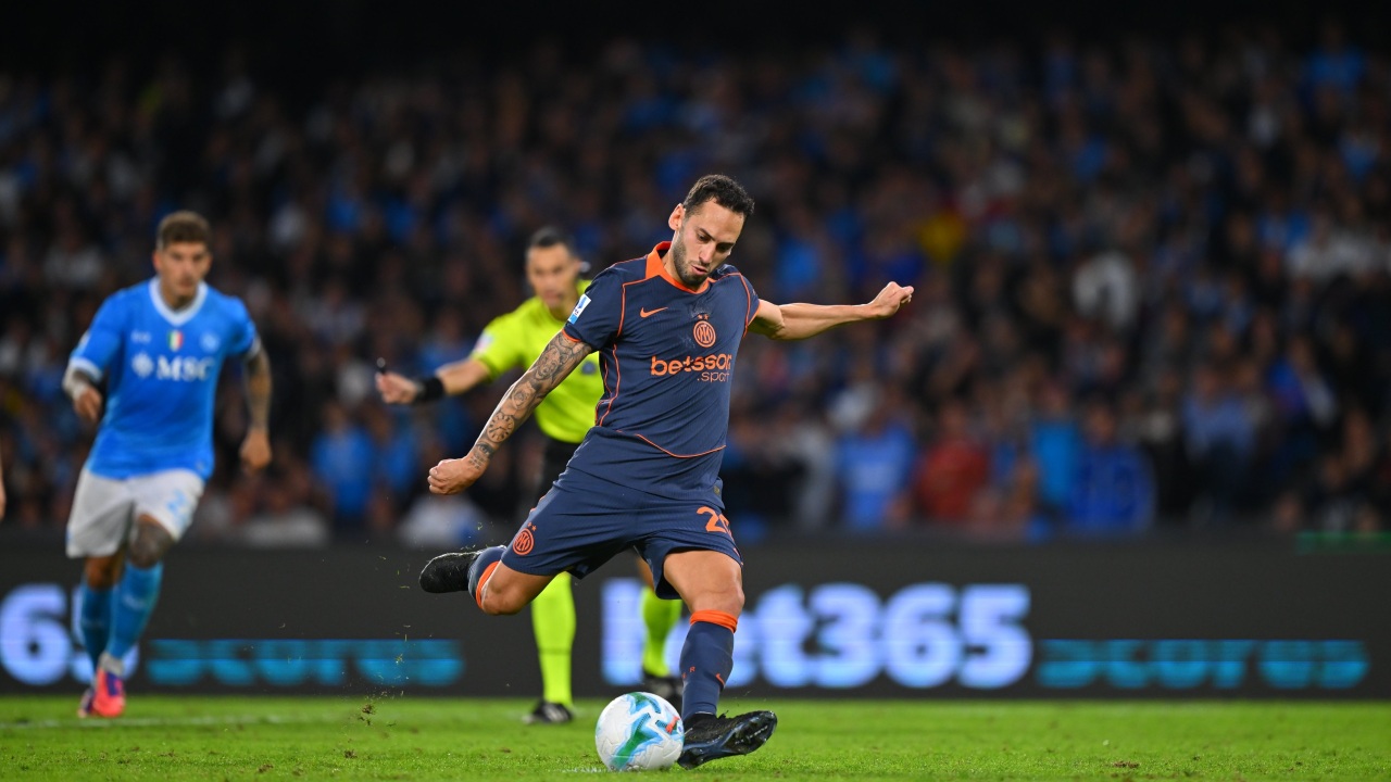 Hakan Calhanoglu menendang penalti saat Inter Milan melawan Napoli di pekan kedelapan Serie A pada 25 Oktober 2025-@Inter-X