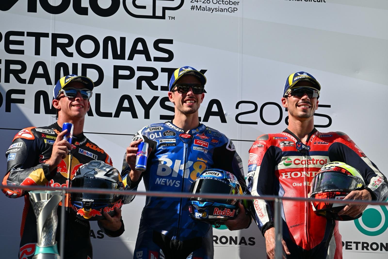 Dari kiri: Pedro Acosta Alex Marquez dan Joan Mir, Top-3 di Grand Prix Sepang 2025, pada hari Minggu 26 Oktober 2025--Twitter Michelin Motorsport @Michelin_Sport