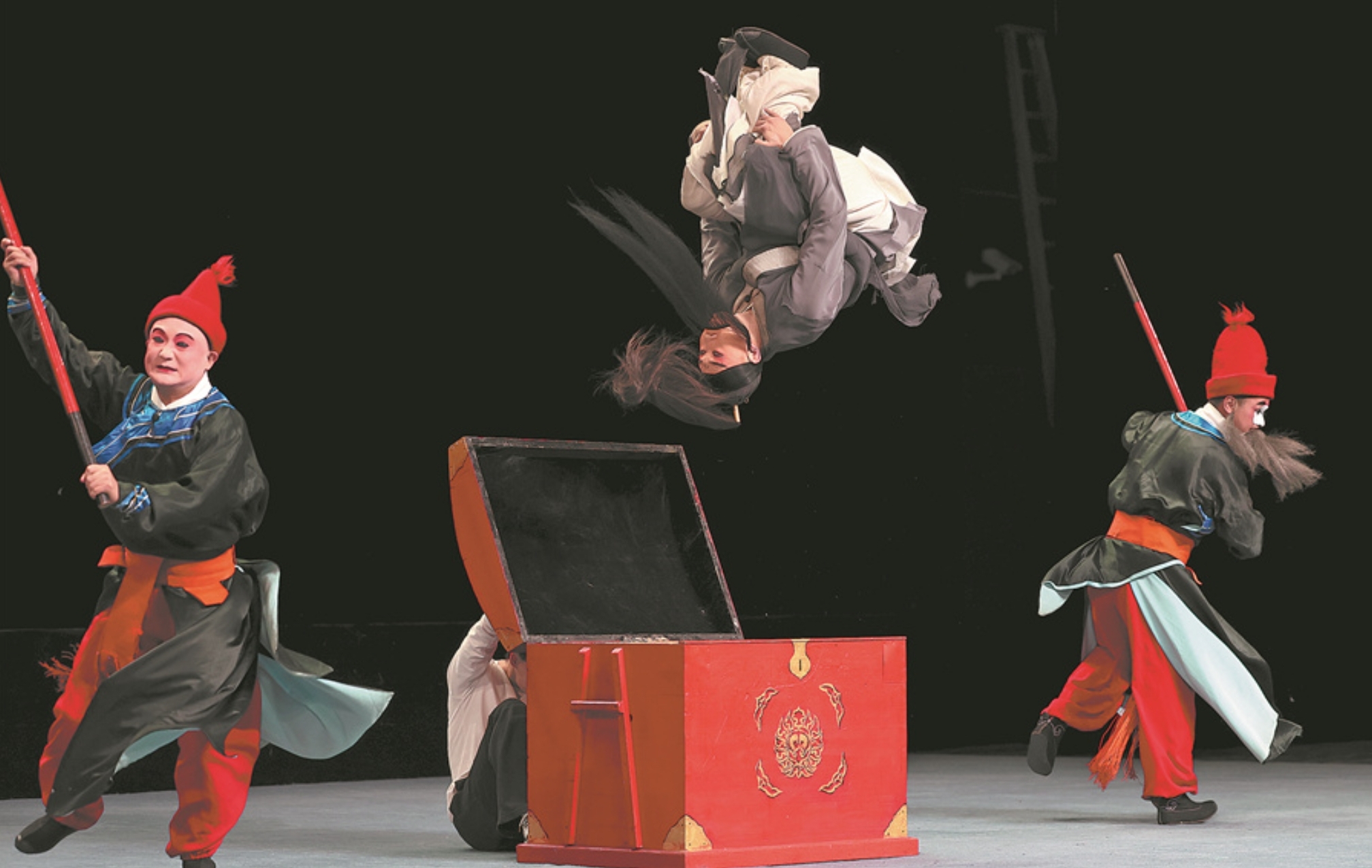 Aktor Dong Xuyang melompat keluar dari kotak di atas panggung di China Wu Opera Grand Theatre di Jinhua, provinsi Zhejiang.-Geng Feifei-China Daily