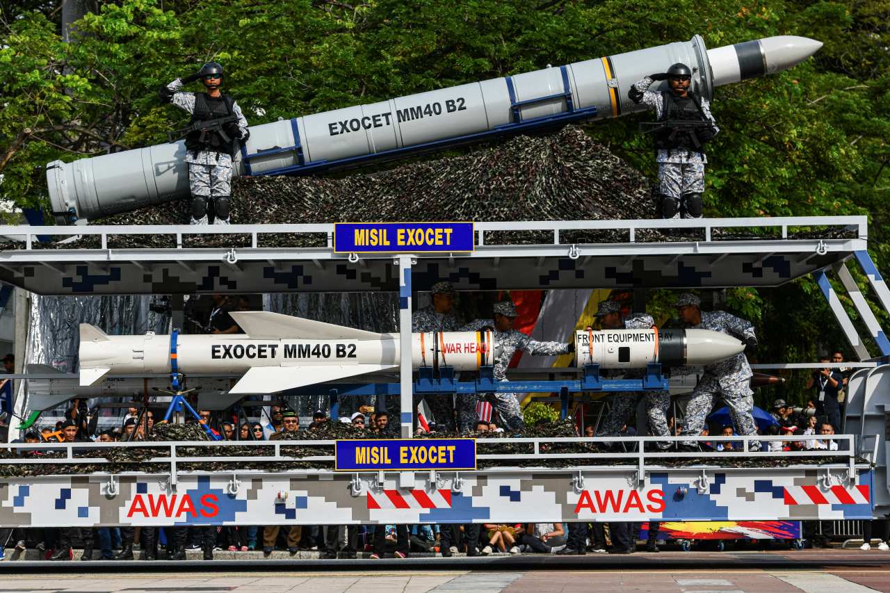 Sebuah perahu apung Angkatan Laut Kerajaan Malaysia melintas sambil memamerkan rudal anti-kapal Exocet buatan Prancis selama parade perayaan Hari Kemerdekaan negara tersebut di Putrajaya pada 31 Agustus 2019..-Mohd Rasfan-via AFP