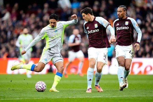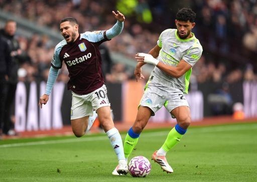 Momen Tijjani Reijnders mencoba menendang bola namun dihalangi oleh dua bek Aston Villa, ketika melawan Aston Villa dalam lanjutan Premier League, Minggu 26 Oktober 2025---Getty Images