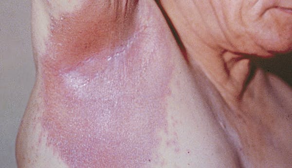 Karena daerah tersebut lembap dan sering bergesekan, ruamnya tampak mengilap dan terasa perih.