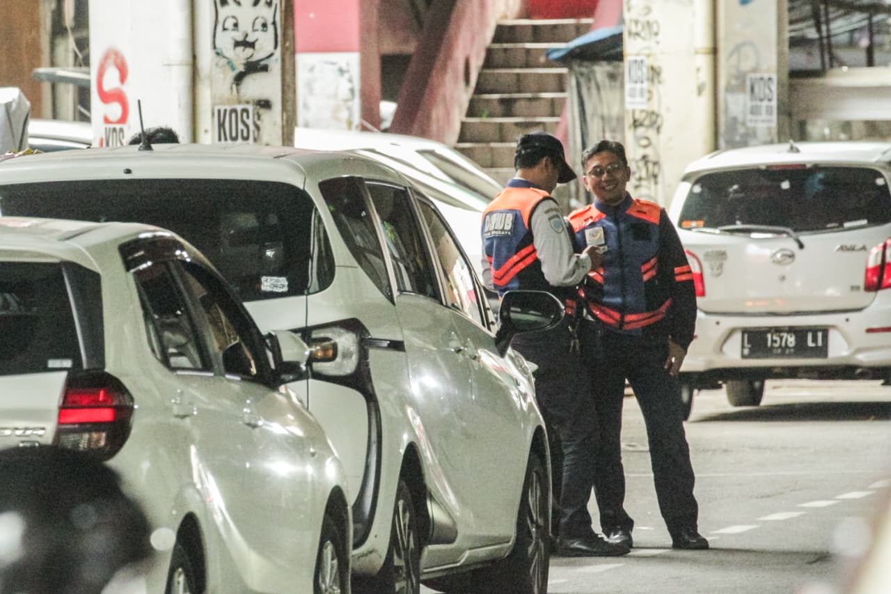 Petugas Dinas Perhubungan berjaga di area parkir Jalan Tanjung Anom untuk memastikan ketertiban dan kelancaran arus kendaraan, Selasa, 28 Oktober 2025-Tirtha Nirwana Sidik-Harian Disway