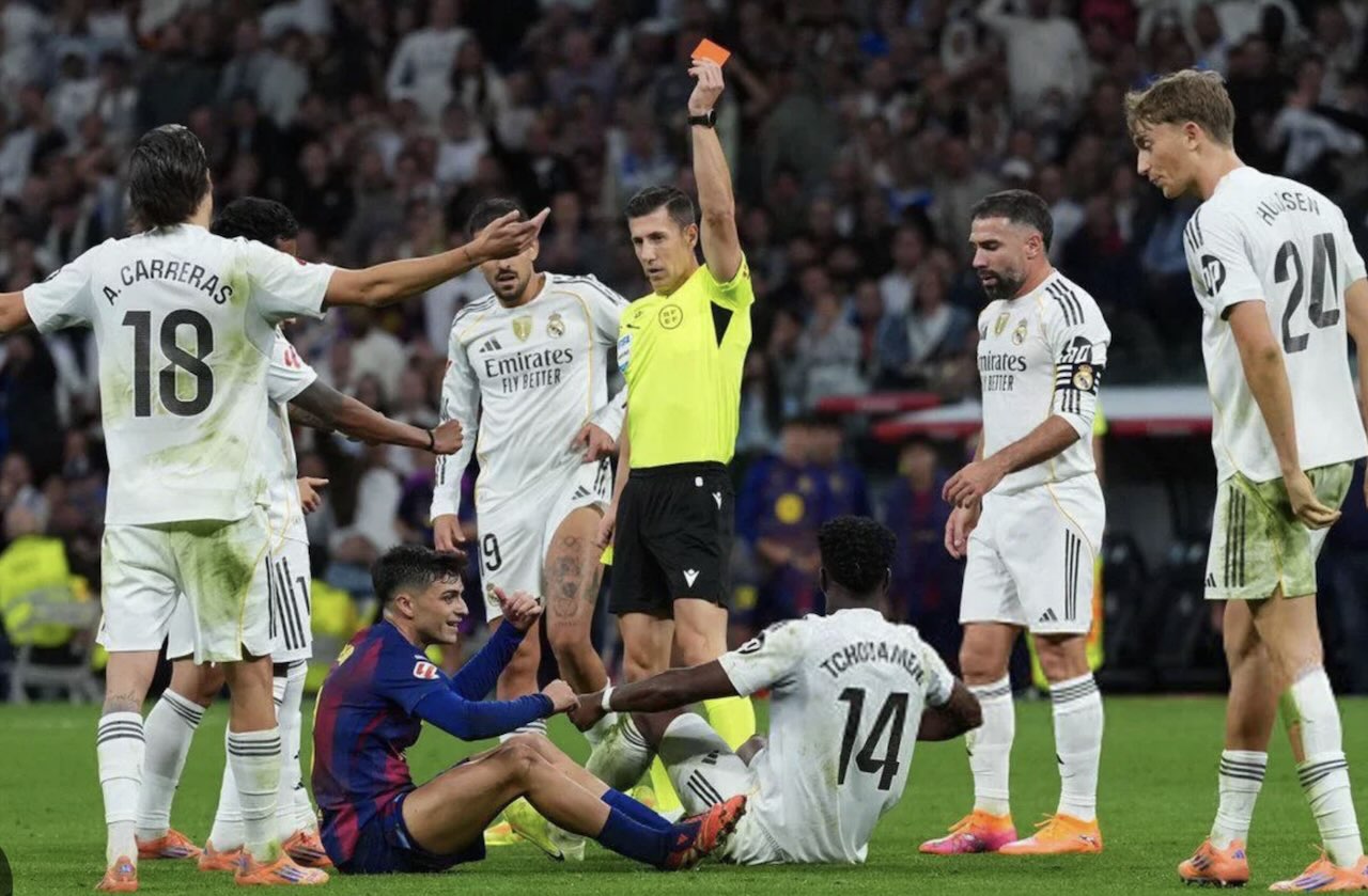 Pedri cedera Usai El Clasico, Barcelona kembali dihantui krisis. Foto: Pedri (duduk) mendapatkan kartu merah di pengujung laga melawan Real Madrid, 26 Oktober 2025.-Oscar del Pozo-AFP