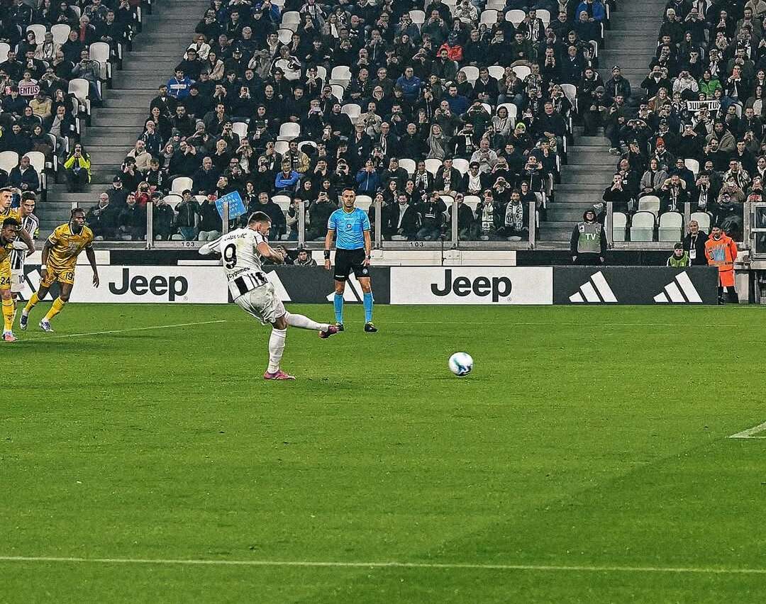 Momen penyerang Juventus, Dusan Vlahovic, ketika mengeksekusi penalti saat menghadapi Udinese. Kamis, 30 Oktober 2025.--Instagram @Juventus
