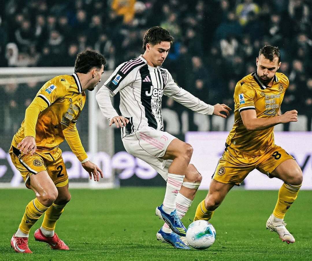 Aksi penyerang muda Juventus, Kenan Yildiz (tengah), ketika berusaha melewati hadangan lini belakang Udinese. Kamis, 30 Oktober 2025.--Instagram @Juventus