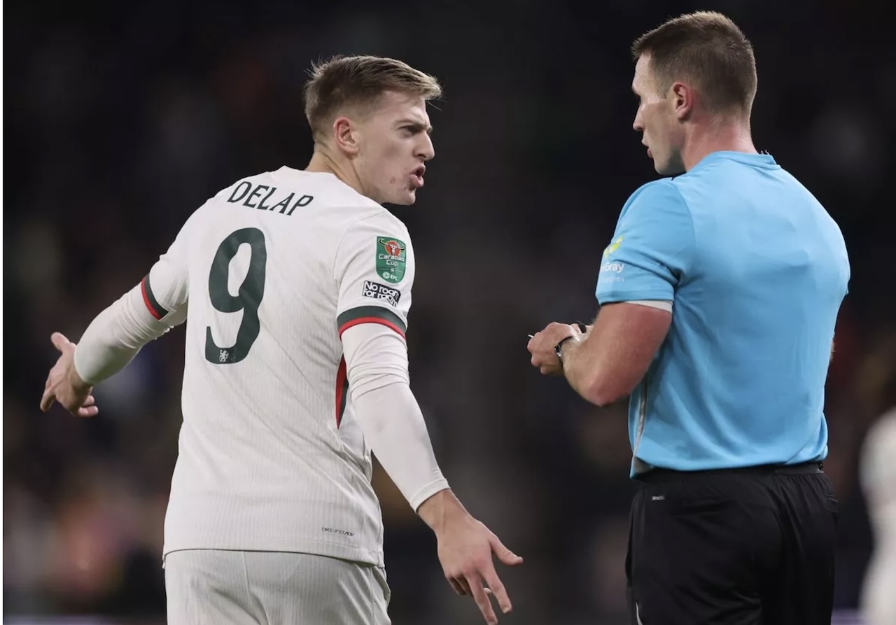 Wolves vs Chelsea 3-4: Lolos ke 8 Besar Carabao Cup, Enzo Maresca sesalkan kartu merah bodoh. Foto: Liam Delap (kiri) berdebat dengan wasit sebelum mendapatkan kartu merah, 30 Oktober 2025. -Darren Staples-AFP