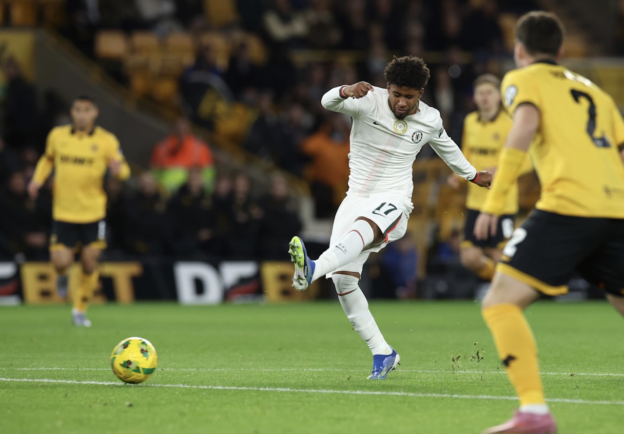 Wolves vs Chelsea 3-4: Lolos ke 8 Besar Carabao Cup, Enzo Maresca sesalkan kartu merah bodoh. Foto: Andrey Santos melepaskan tembakan yang berbuah gol pertama Chelsea, 30 Oktober 2025.-Darren Staples-