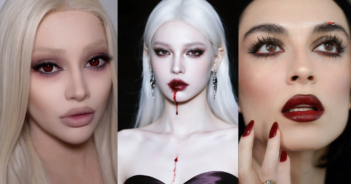 Riasan vampir selalu populer dan ikonik saat Halloween. Kulit dibuat lebih pucat dengan foundation terang, dipadukan dengan lipstik merah gelap dan eyeliner tegas untuk menonjolkan aura misterius.