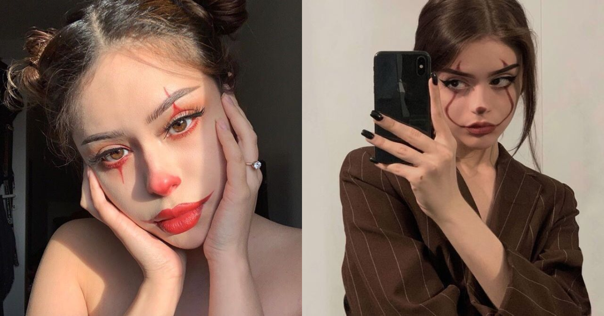 Riasan ala badut selalu menjadi pilihan klasik saat Halloween. Sentuhan garis merah di mata hingga bibir, ditambah efek ilusi tersenyum, membuat tampilan terlihat menyeramkan sekaligus artistik.