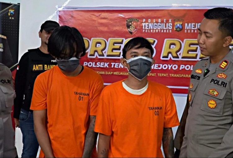 Dua tersangka berinisial AS dan AM saat konferensi pers usai ditangkap di Polsek Tenggilis Surabaya-Humas Polsek Tenggilis-