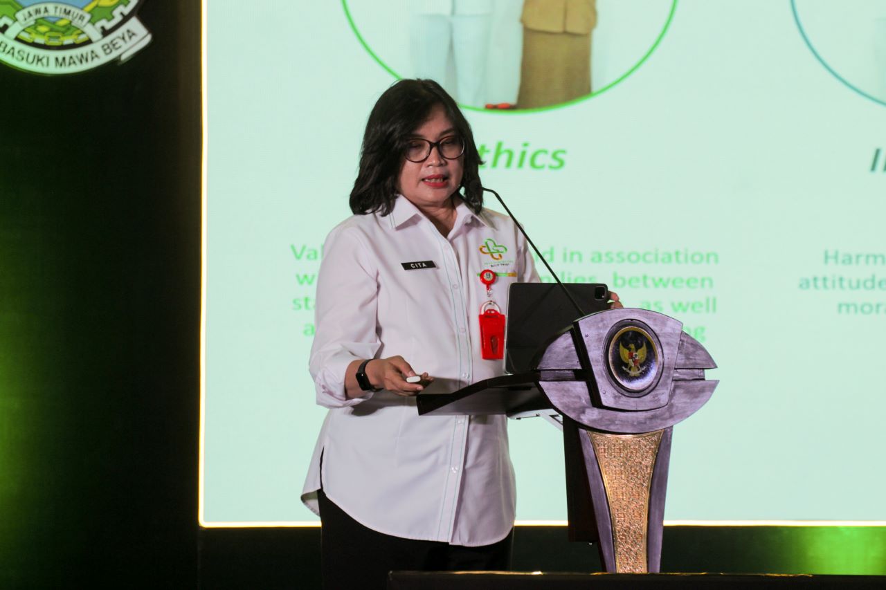 DIREKTUR RSUD Dr. Soetomo, Prof. Dr. Cita Rosita Sigit Prakoeswa, menyampaikan sambutannya dalam peringatan HUT ke-87. -Tirtha Nirwana Sidik-Harian Disway-