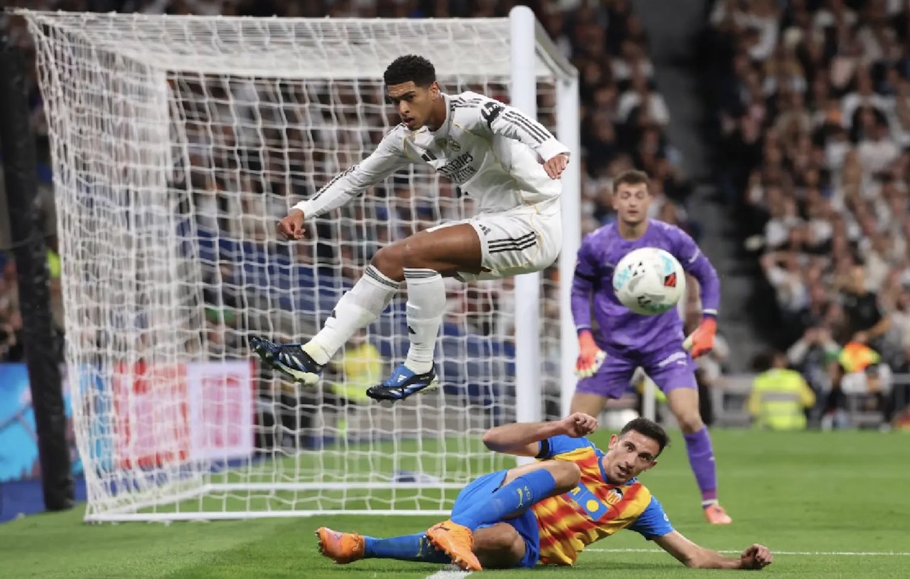 Real Madrid vs Valencia 4-0, brace Mbappe bawa Los Blancos nyaman di puncak. Foto: Jude Bellingham menekan pertahanan Valencia sebelum mencetak gol.-Oscar del Pozo-AFP