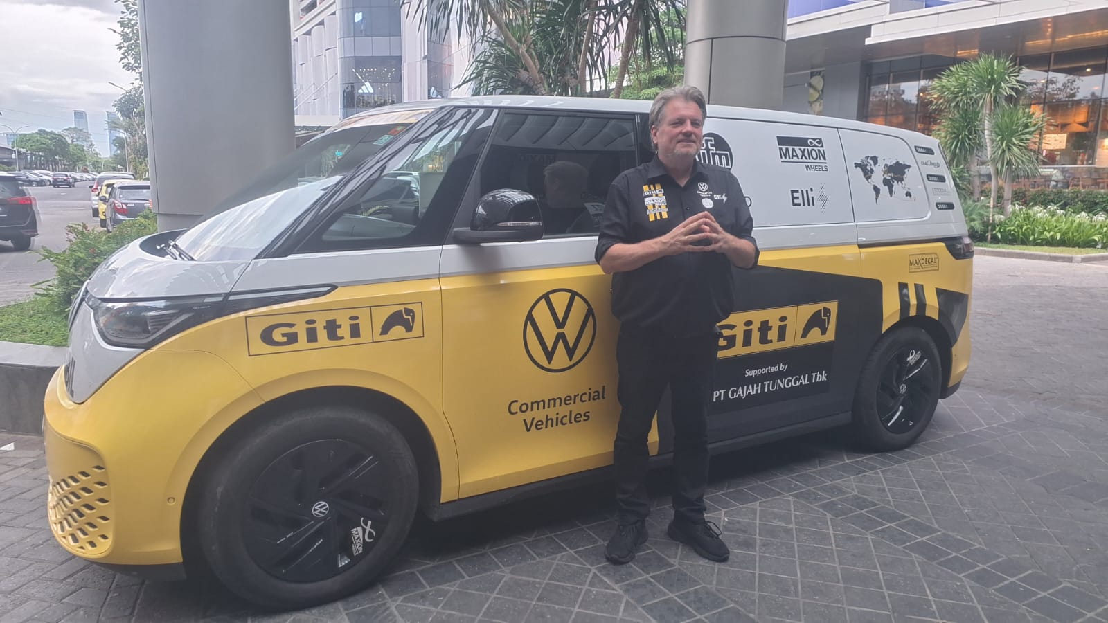 Rainer Zeitlow dan Volkswagen ID. Buzz, kendaraan yang dibawanya berkeliling 75 negara untuk memecahkan rekor dunia.-Guruh D.N.-