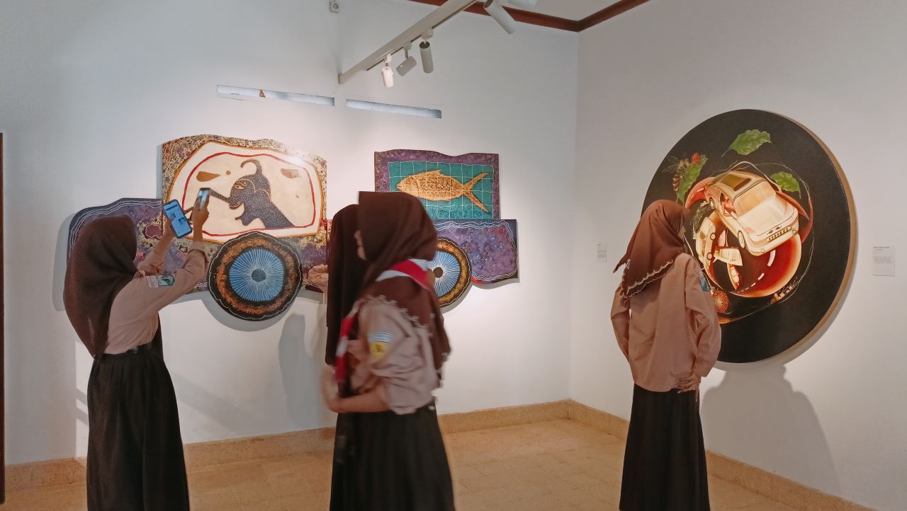 EMPAT SISWI SMA melihat dan merekam lukisan karya Beny Dewo pada Jumat, 31 Oktober 2025.-Indria Pramuhapsari-Harian Disway-