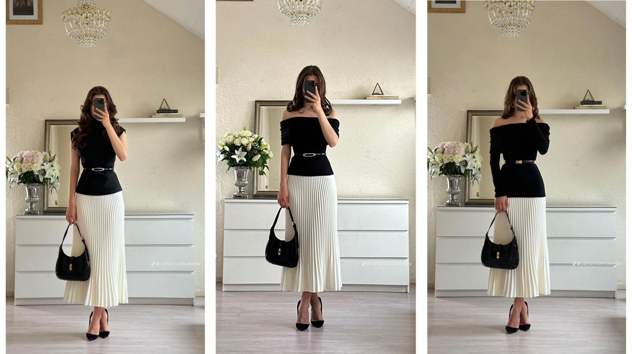 Catharina tampil feminin dengan paduan hitam putih yang elegan dan menawan.-@catharinaelisabethx-TikTok