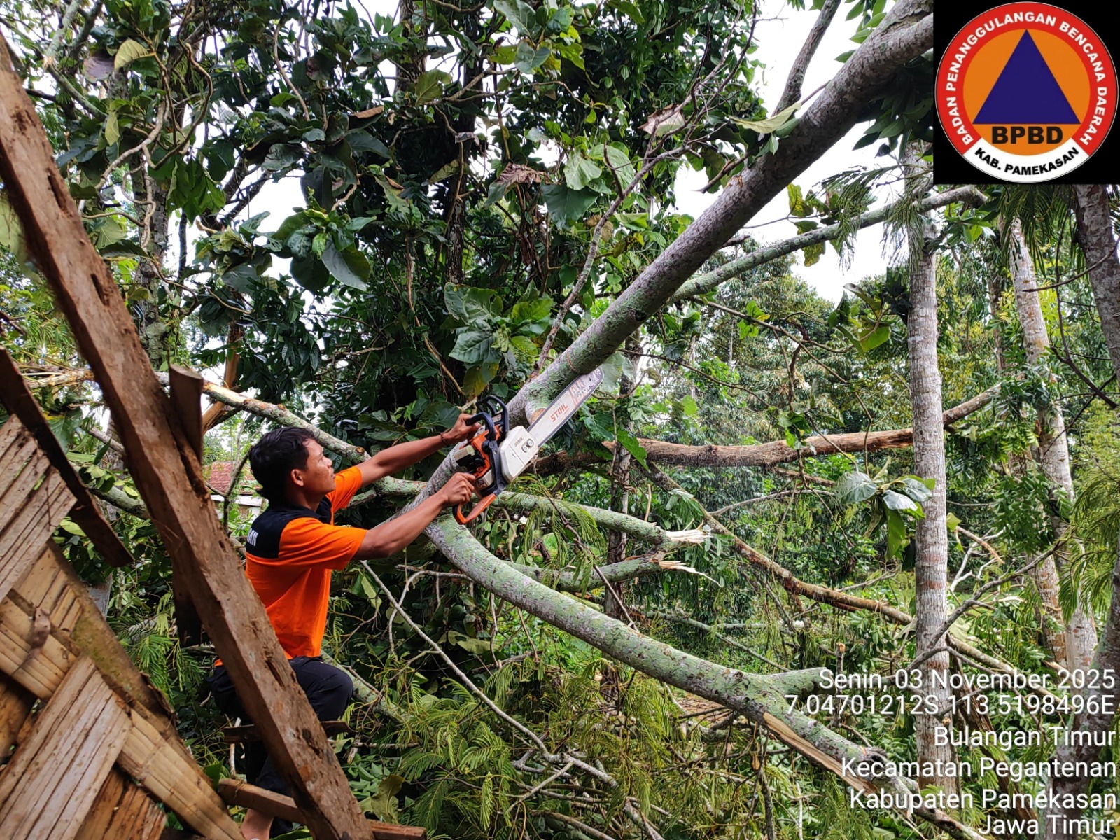 Petugas tengah memotor ranting pohon yang tumbang di desa Bulangan Timur, Kecamatan Pengantenan, Pamekasan. Cuaca buruk memicu sejumlah bencana hidrometeorologis di sejumlah daerah di Jatim-BNPB-