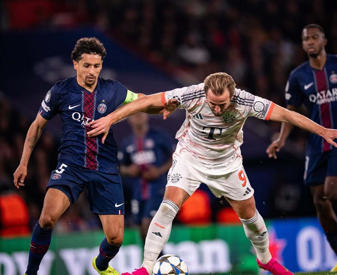 Aksi penyerang Bayern Munchen, Harry Kane (kanan), berusaha mengawal bola dari bek PSG, Marquinhos (kiri). Rabu, 5 November 2025.--instagram @fcbayern