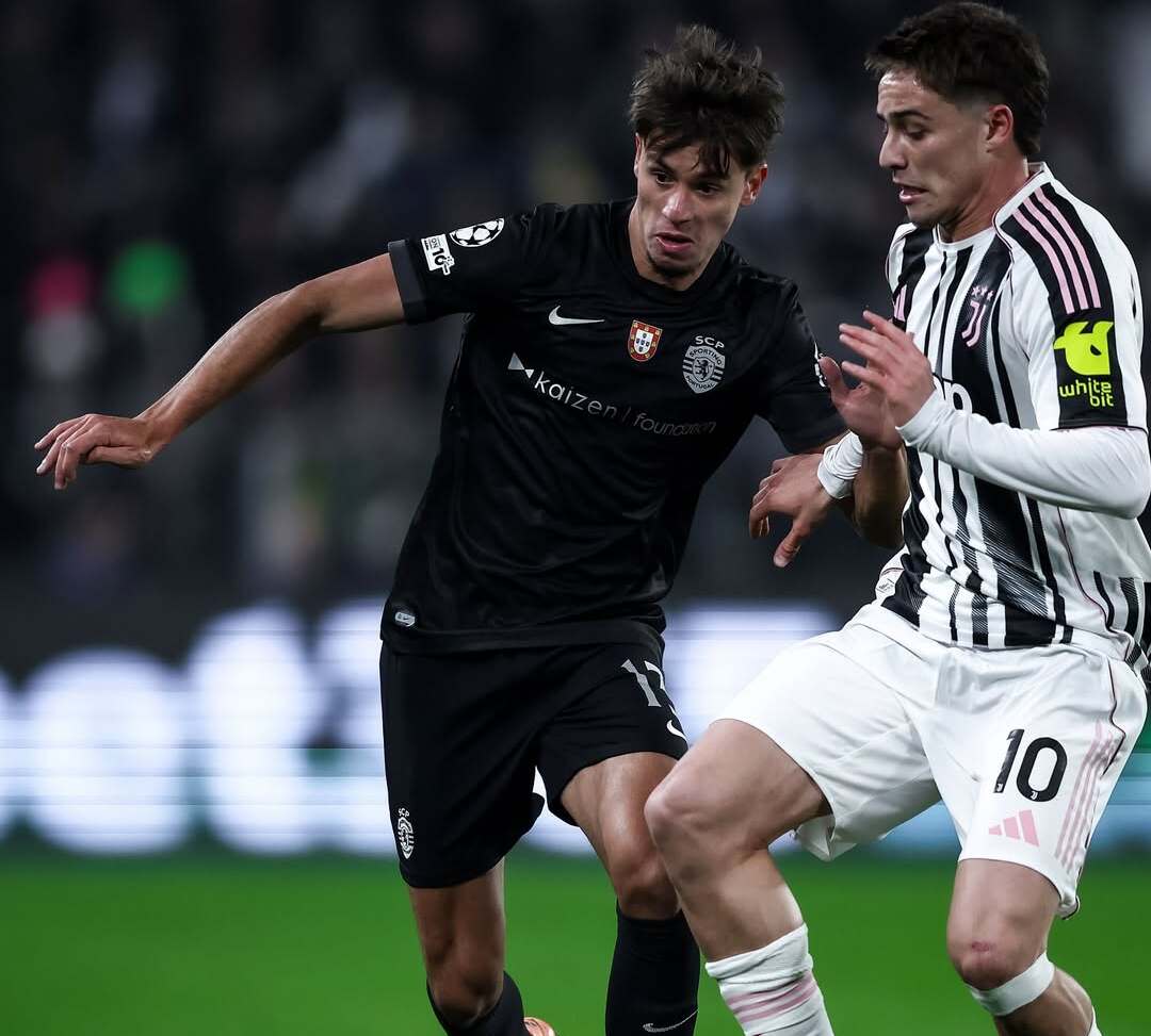 Aksi winger Sporting CP, Francisco Trincao (kiri), berusaha melewati hadangan pemain muda Juventus, Kenan Yildiz (kanan). Rabu, 5 November 2025.--Instagram @sportingcp