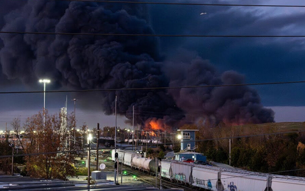 Api dan asap menandai lokasi kecelakaan pesawat kargo UPS di dekat Bandara Internasional Louisville Muhammad Ali pada 4 November 2025 di Louisville, Kentucky.--Stephen Cohen / GETTY IMAGES NORTH AMERICA / Getty Images via AFP