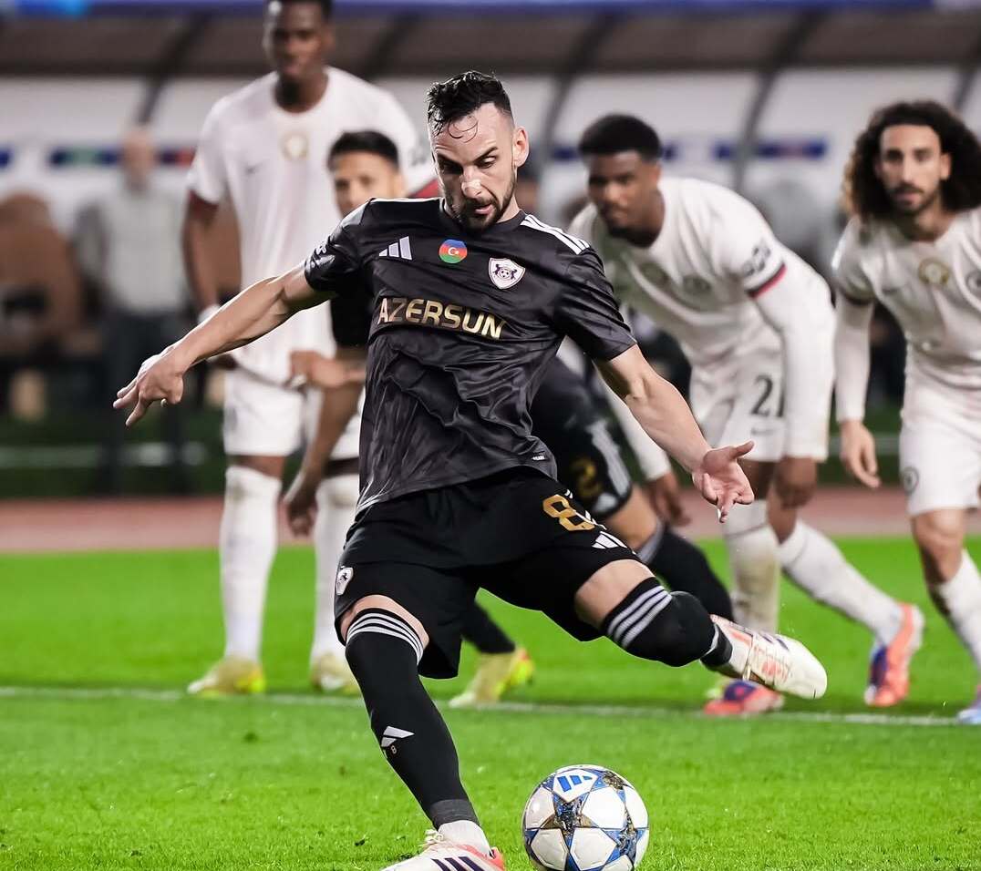 Aksi gelandang Qarabaq, Marko Jankovic, ketika mengeksekusi penalti pada laga kontra Chelsea. Kamis, 6 November 2025.--Instagram @fkqarabgh