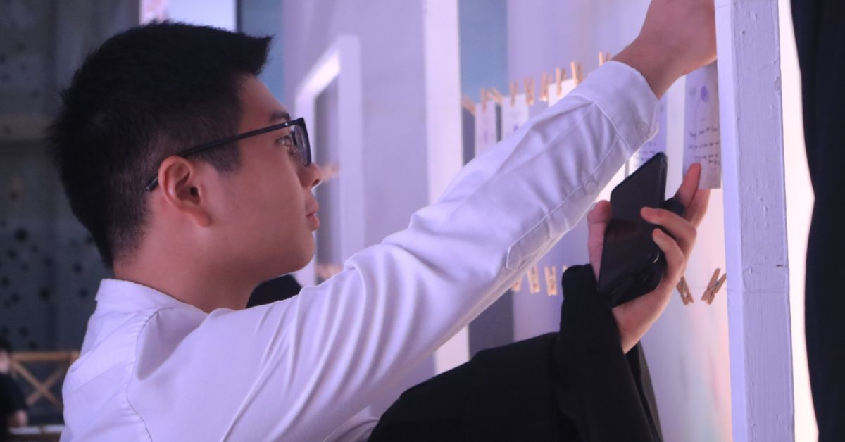MENJEPIT kertas ucapan untuk Elena, teman-teman dari SMA Katolik St. Louis 1 Surabaya mendoakan kesuksesan gadis 17 tahun itu. - Naufal Adibi - Harian Disway