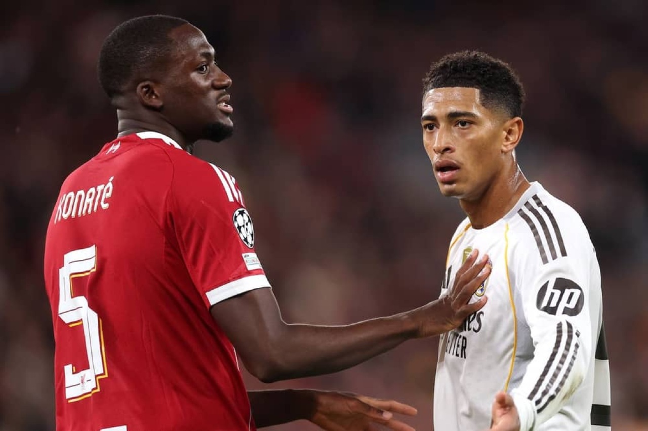 Momen Ibrahima Konate (kiri) dan Jude Bellingham (kanan) dalam laga Liverpool vs Real Madrid, lanjutan pekan keempat Liga Champions 2025/2026, Rabu 5 November 2025--Getty Images