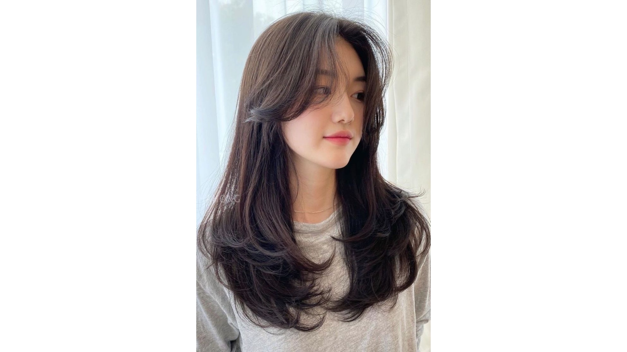Curtain bangs membingkai wajah dengan lembut, membuat pipi tampak kecil dan dagu lebih lancip.--Pinterest