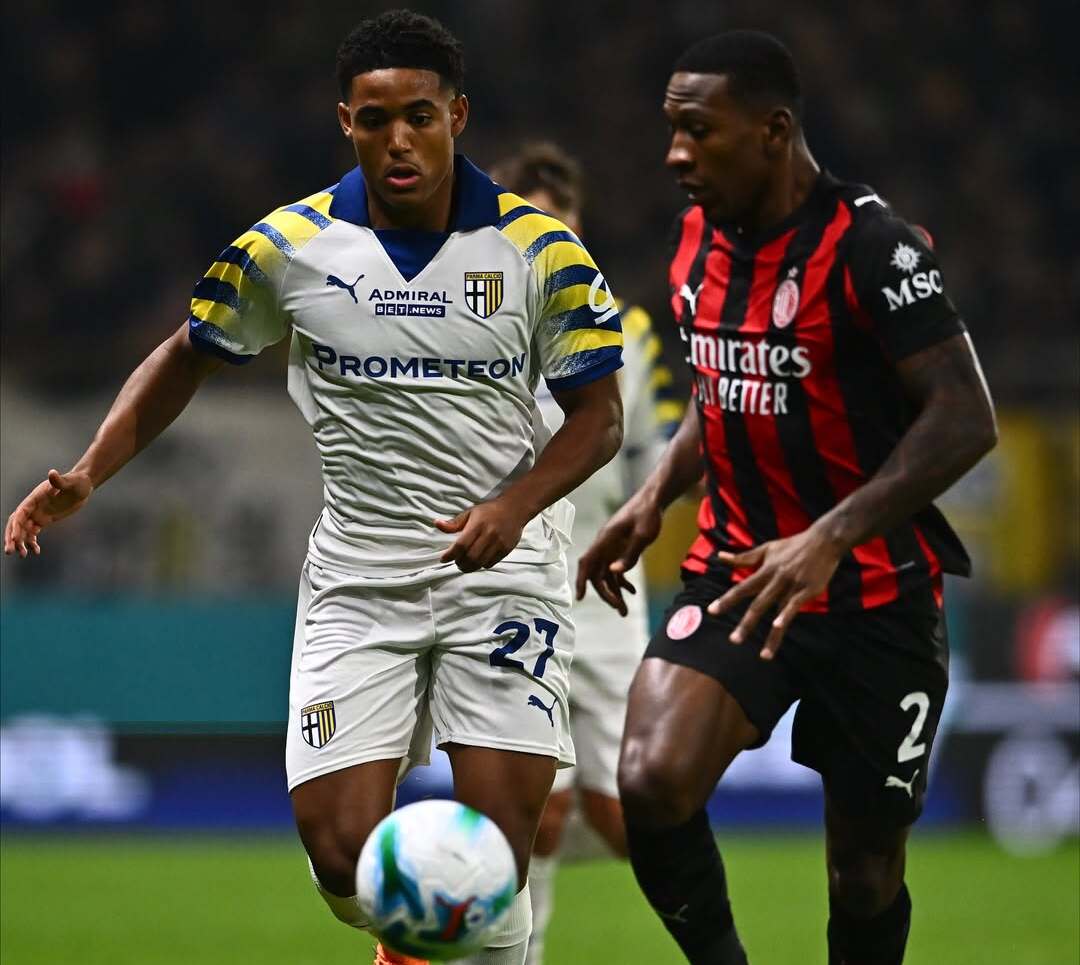 Aksi winger AC Milan, Pervis Estupinan (kanan), ketika berebut bola dengan pemain Parma, Sascha Britschgi (kiri). Minggu, 9 November 2025--Instagram @parmacalcio1913