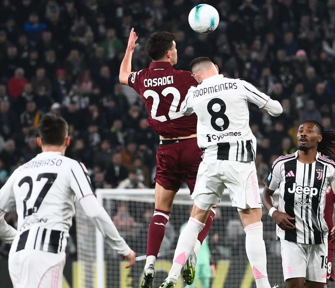 Aksi gelandang Juventus, Teun Koopmeiners (nomor 8), ketika berduel udara dengan gelandang Torino, Cesare Casadei (nomor 22). Minggu, 9 November 2025--Instagram @torinofc1906