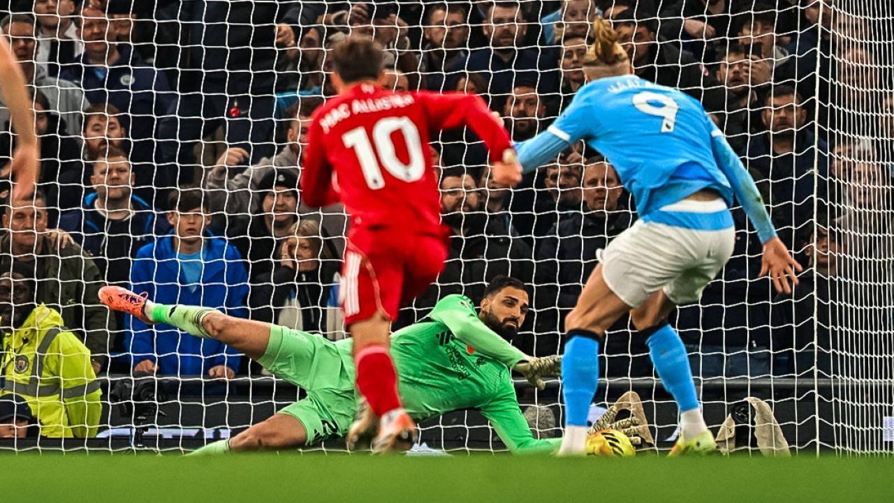 Erling Haaland maju sebagai eksekutor, namun Giorgi Mamardashvili tampil heroik. Kiper asal Georgia itu menebak arah bola, menepis tendangan Haaland yang mengarah ke sisi kanan bawah.