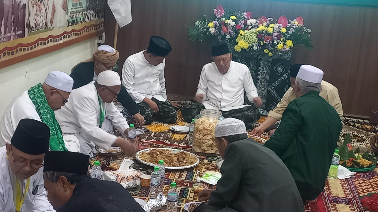 Para kiai dan pengurus Nahdlatul Ulama menikmati kebersamaan dalam jamuan sederhana usai kegiatan Mujahadah Pejuang di Gedung HBNO, Surabaya, Minggu malam (9/11/2025).--