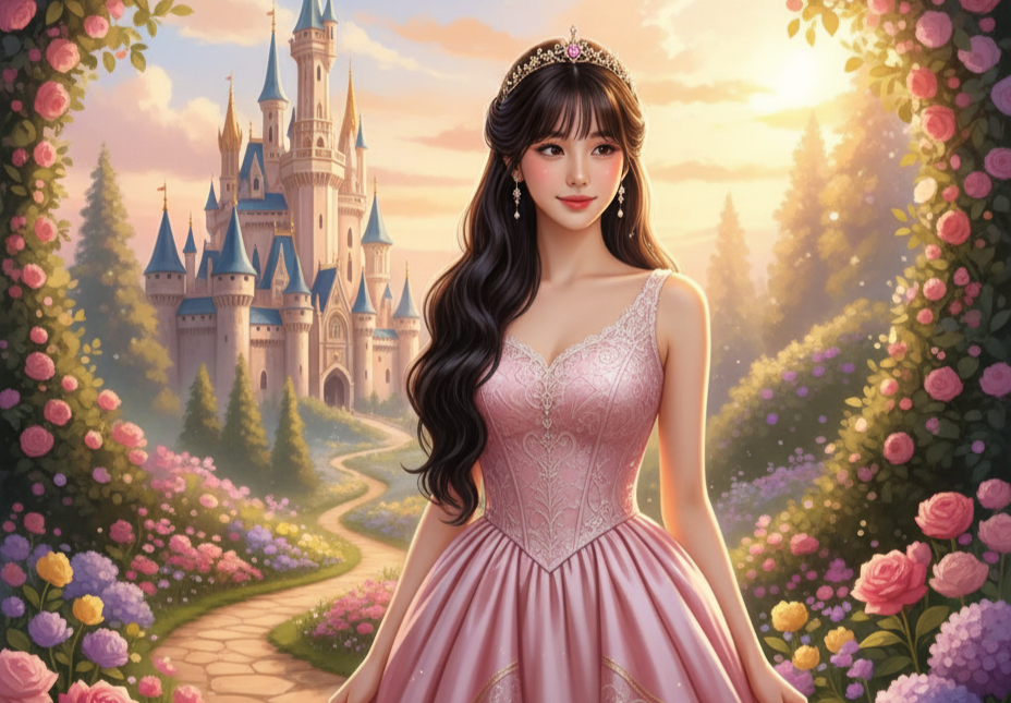 Transformasikan foto menjadi karakter putri dengan gaun elegan, rambut berkilau, dan mahkota kecil. Gunakan pencahayaan hangat keemasan serta latar taman bunga dan kastil di kejauhan. Ekspresi wajah lembut tapi berwibawa.