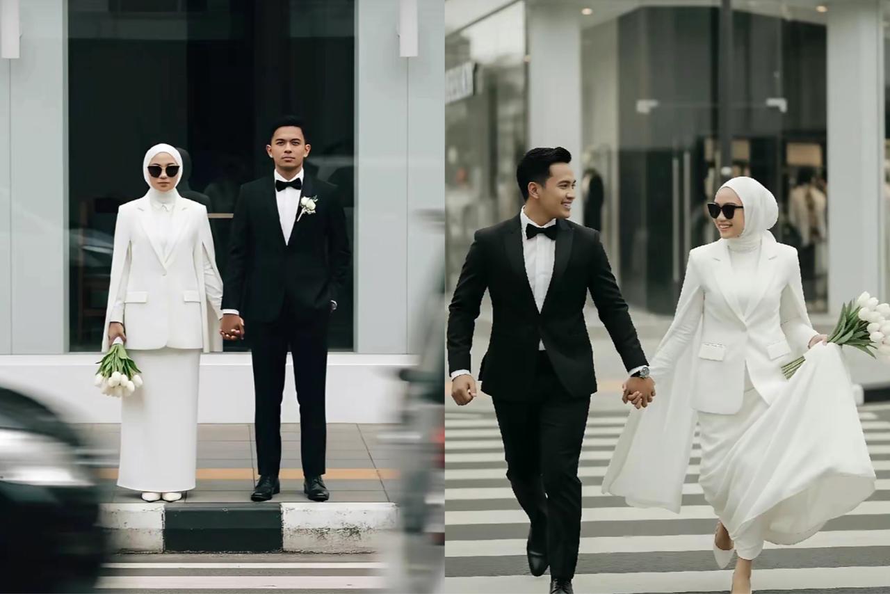 Mempelai wanita mengenakan jilbab putih polos, kacamata hitam ramping, dan blazer panjang bergaya jubah di atas kemeja putih, sambil memegang buket tulip. Sementara itu, pria tampil rapi dengan tuksedo hitam klasik, dasi kupu-kupu, dan boutonniere di kerah.