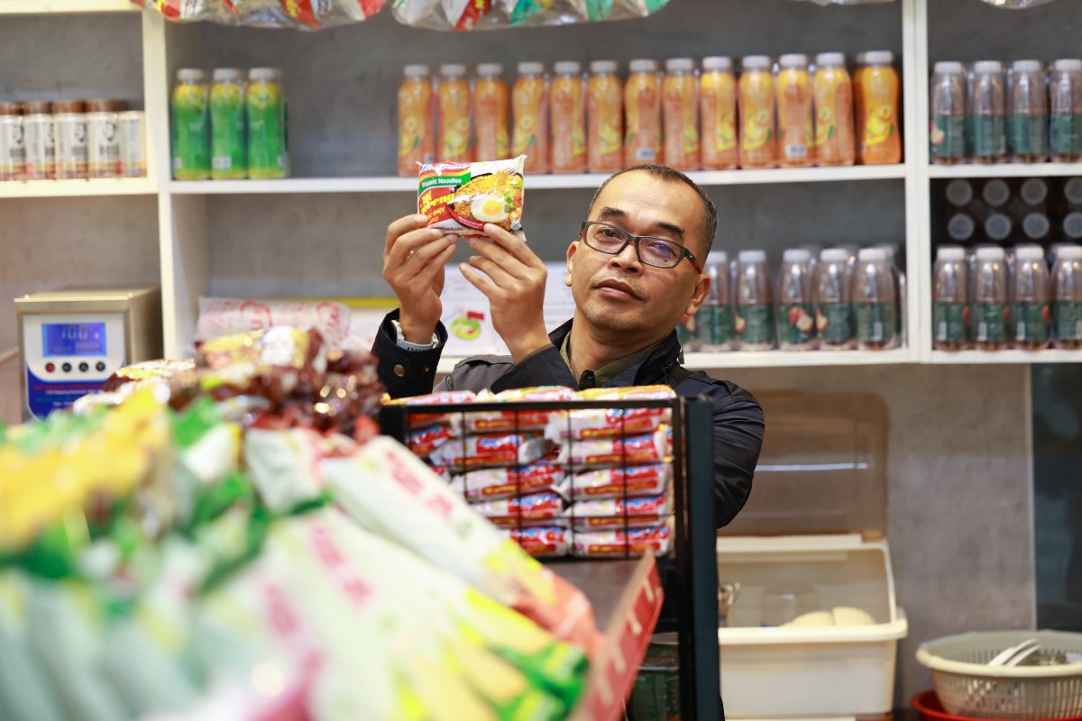 Permred Investor Daily Djaka Susila menunjukkan Indomie yang dijual di kantin VinUniversity.-Foto: Tomy Gutomo-Harian Disway-