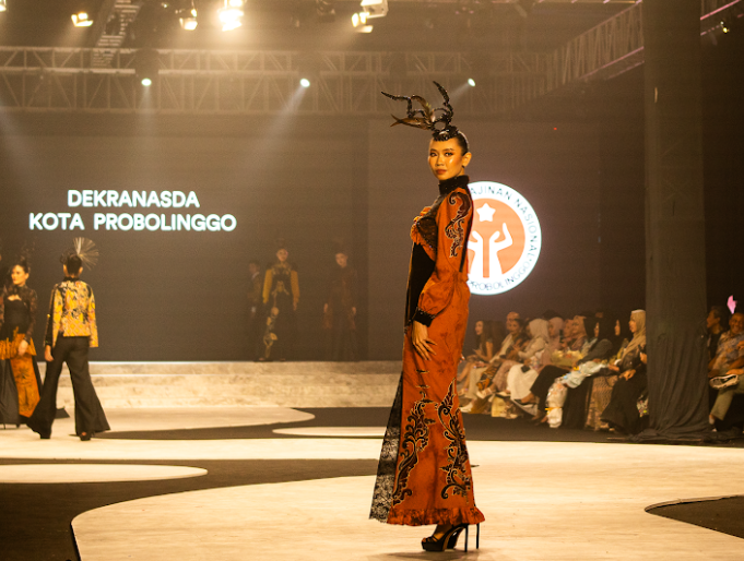 TERUSAN bercorak batik kreasi Dekranasda Probolinggo ini semakin unik dipadukan headpiece yang dipakai model. -Afif Siwi-HARIAN DISWAY