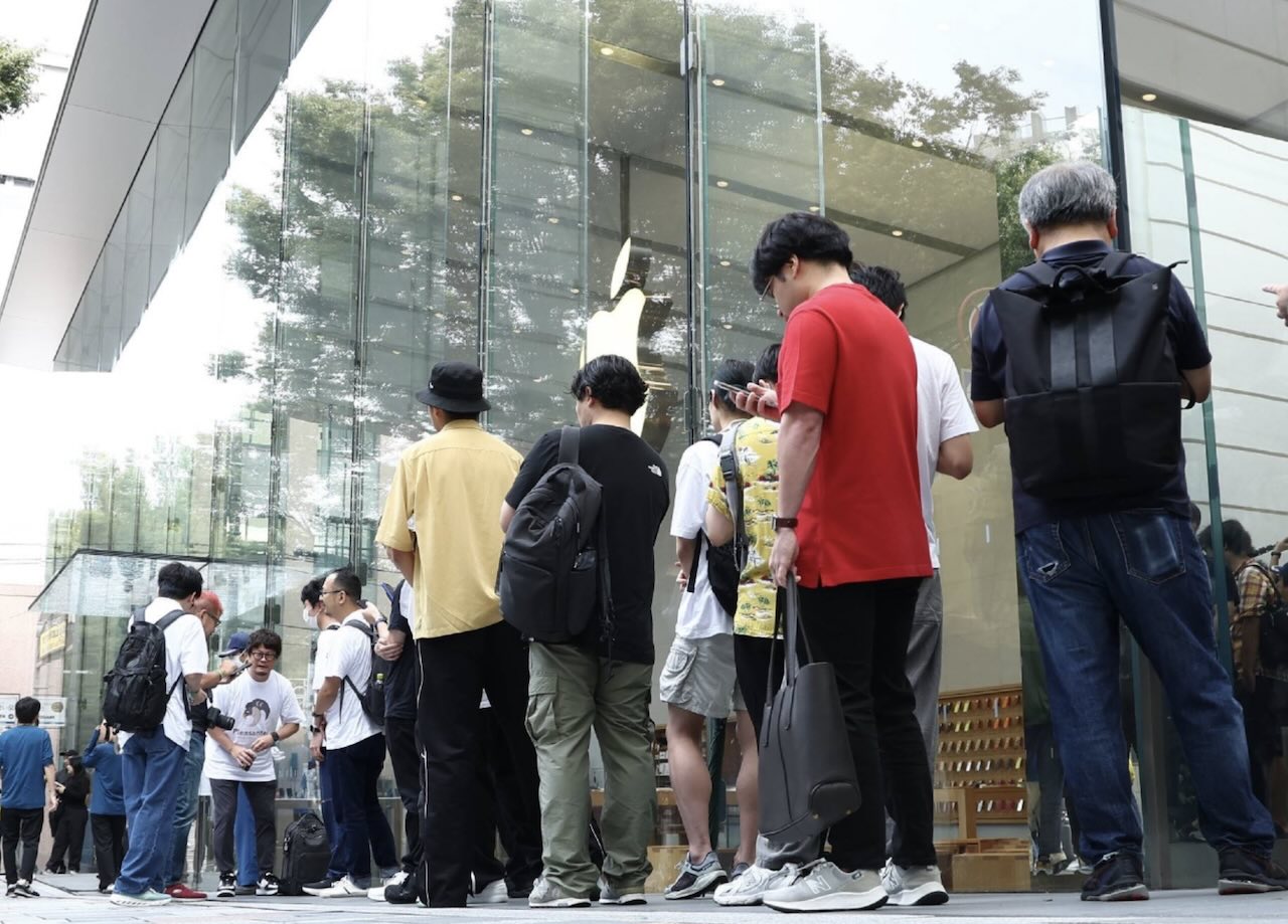 Perbedaan iPhone Ori dan iPhone Inter, mana yang harus dipilih? Foto: Konsumen antre memasuki toko Apple di Tokyo pada hari rilis iPhone baru.-AFP-
