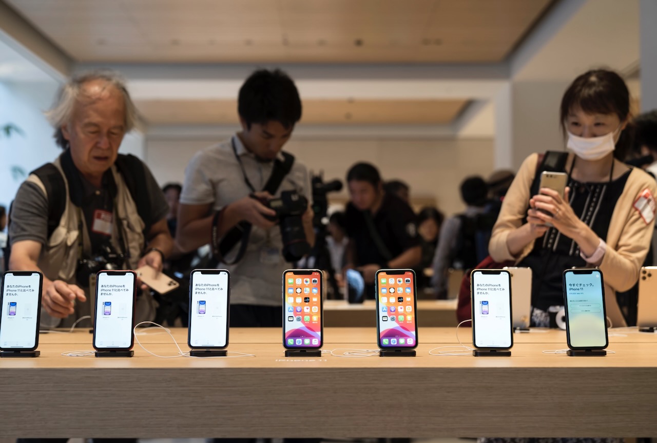 Perbedaan iPhone Ori dan iPhone Inter, mana yang harus dipilih? Foto: Konsumen memadati toko Apple di Tokyo pada hari rilis iPhone baru.-AFP-