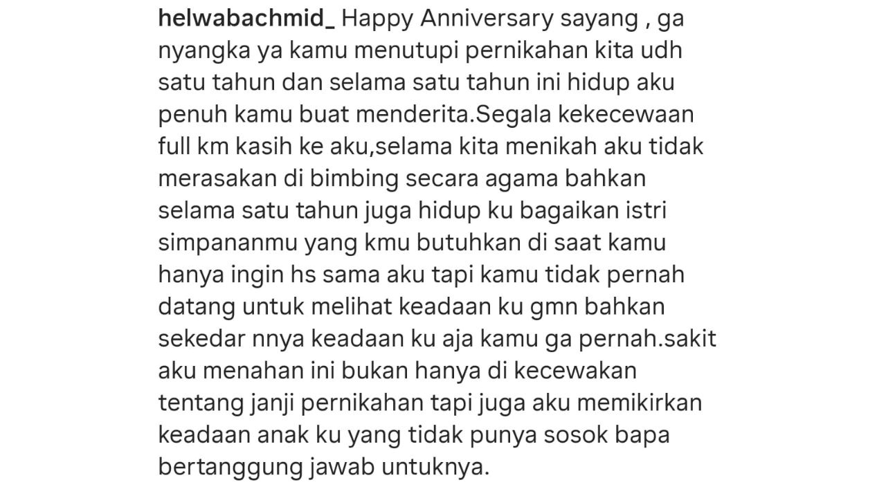 Dalam postingannya, Helwa menceritakan pengalamannya merasa seperti ‘istri simpanan’ yang hanya dipanggil saat dibutuhkan, menunjukkan sisi lain rumah tangganya yang penuh tekanan.--Instagram @helwabachmid_