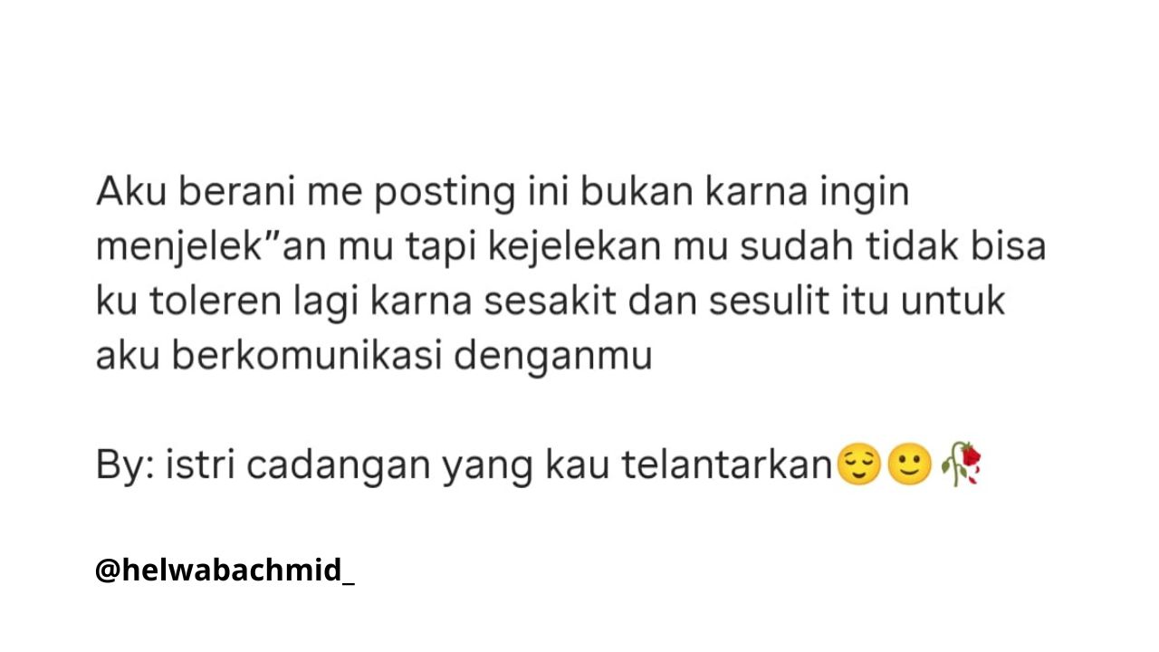 Helwa menegaskan bahwa ia membuka kisah ini bukan untuk menjatuhkan reputasi suaminya. "Aku berani memposting ini bukan karena ingin menjelek-jelekanmu, tapi kejelekanmu sudah tidak bisa aku toleransi lagi karena sesakit dan sesulit itu untuk berkomunikasi denganmu," tulisnya di Instagram.